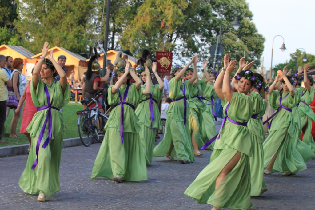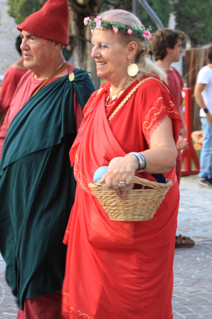 Als erster fährt ein Ochsenwagen, danach sind hochgestellte Persönlichkeiten, die Römer, die Musikanten und dann die Tänzerinnen. Sie laufen mit dem Festzug, Brigitte macht viele Fotos und danach haben sie sich eine Pause verdient. Um 22:30 beginnen die Gladiatorenkämpfe. Ein Römer erklärt alle Waffen, leider ist alles auf Italienisch und so wird die Show etwas langwierig. Sie beschließen nicht bis zum Ende zu bleiben und machen sich auf den Weg zu mir, wobei sie noch auf ein Glas Wein stehen bleiben. Spät, erschöpft und Müde fallen sie in die Kojen.