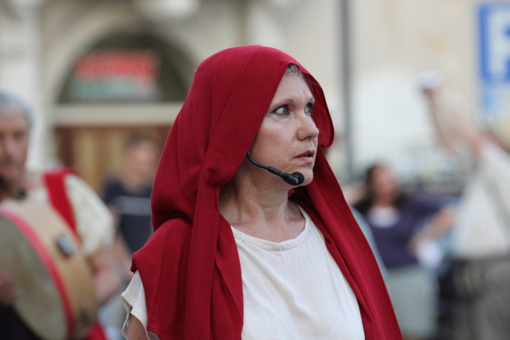 Sie verlassen das keltische Dorf und spazieren zum Lager der Römer. Dort gibt es Würstchen nach altem Gebrauch zubereitet. Sie sehen den Ritus zur Gründung Aquileia. Nach einer langen Rede beginnt der Festzug durch Aquileia.