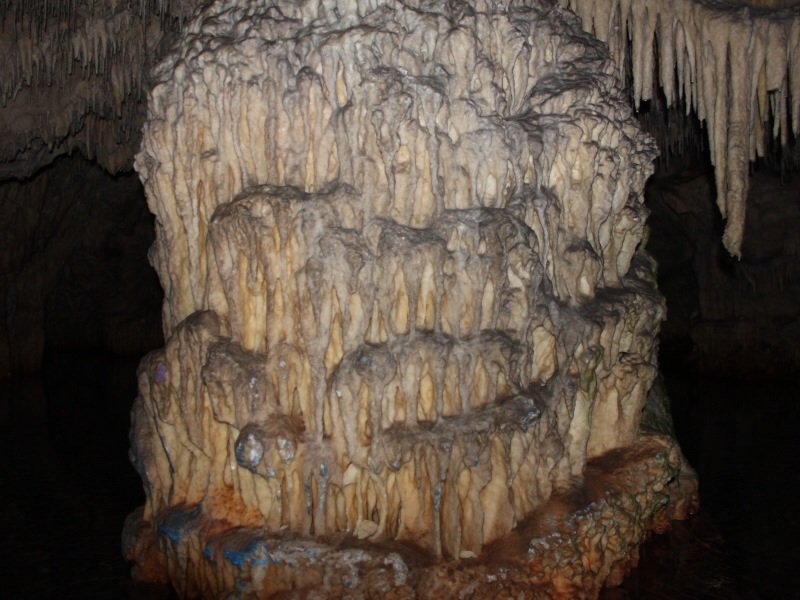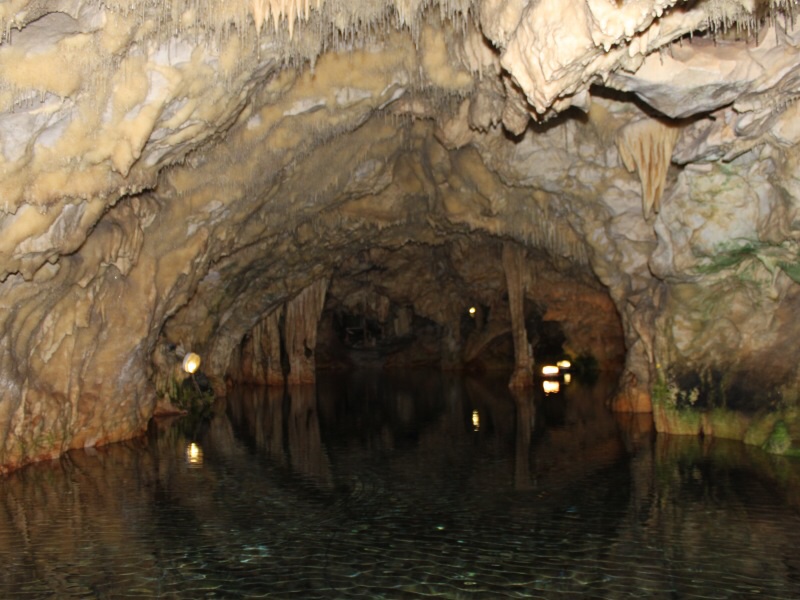 Um 08:30 öffnet laut unserem Reiseführer die Tropfsteinhöhle. Dinghi ist schnell vorbereitet und wir sind um 08:15 beim Eingang. Die Kassa ist weiter oben und so „wallern“ wir hoch. Dort wird uns mitgeteilt die Kassa sperrt erst um 09:00 auf – also warten. Um 08:35 hat man erbarmen mit uns und gewährt uns eine Eintrittskarte ( Pro Kopf 12.- €). Trotzdem warten wir bis 09:30 bis wir endlich schreckliche Schwimmwesten angelegt bekommen und in ein Kanu einsteigen können. Die Tropfsteinhöhle ist wunderschön, aber dadurch das sie so nieder ist auch bedrückend und die Führung war auf griechisch.