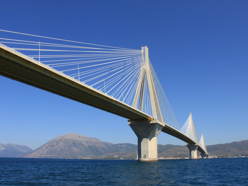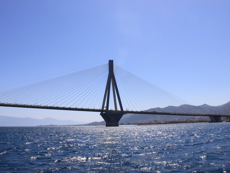 Die Brücke Harilaos Trikoupi ist 2,2 km lang und mußte als Schrägseilbrücke gebaut werden, damit sie ein Erdbeben der Stärke 7 und Windstärken bis zu 140 km/h aushält. Und es gab noch das Problem, dass sich der Peloponnes jährlich um ein paar Millimeter vom Festland entfernt, zu lösen. Für griechische Verhältnisse eine reife Leistung , denn in nur 4 Jahren Bauzeit wurde sie im August 2004 eröffnet und sie ist auch fertig.