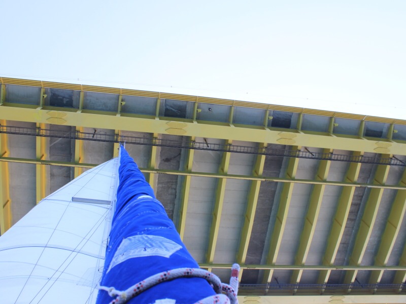 Die Brücke ist Mautpflichtig und kostet über 13€. Will man unten durch, muss man sich 4sm vor der Brücke beim Rio Traffic melden. Man gibt die Länge des Bootes, die Masthöhe und den Zielort an, dann erhält man Anweisungen wo man durchfahren darf. 1Seemeile davor meldet man sich nochmals und man bekommt die Freigabe für die Durchfahrt. Wir durften die südliche Durchfahrt benutzen und wir konnten hindurchsegeln.