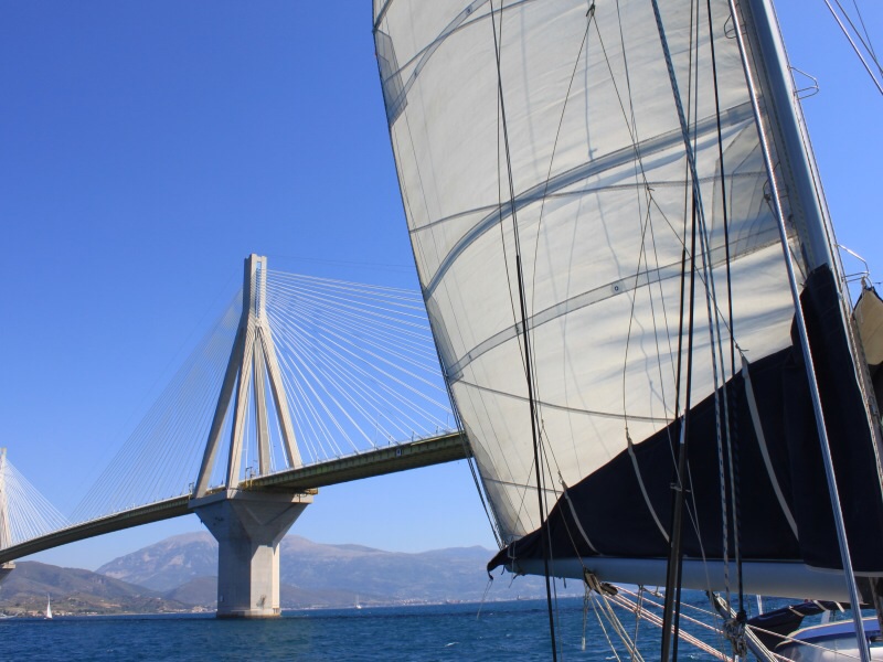 Zeitig geht es weiter, denn wir wollen nach Patras und noch einen Liegeplatz bekommen. Am Anfang müssen wir noch motoren, dann aber kommt Wind auf und wir segeln zuerst mit Groß und Genua, später nur mehr mit Groß vor dem Wind Richtung der Brücke, die den Peloponnes und das Festland verbindet.