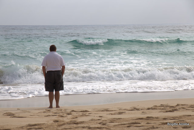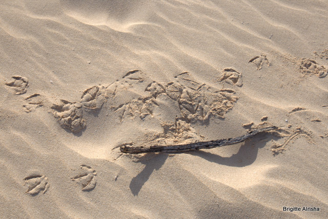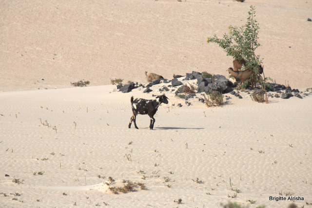 In den Dünen leben auch Ziegen, so wie es auf der ganzen Insel immer wieder Ziegen zu sehen gibt. Meist sind sie aber hinter Zäunen, diese aber dürften wilde Ziegen sein. Es scheint an ein Wunder zu grenzen, das die von so wenig überleben können. Wir erklimmen die erste Düne und dann noch eine, um dann endlich am Meer zu sein. Heute ist am Strand eine rote Flagge, kein Baden erlaubt. Erstens ist die Brandung heute sehr stark und damit geht auch oft eine Strömung einher. Zurück beim Auto haben wir überall Sand.