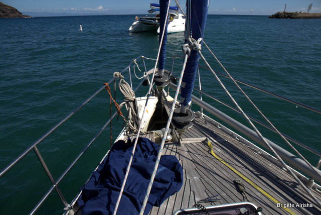 Ach ja, habe ich schon erwähnt, gestern kam noch ein Katamaran rein und ankerte über unseren Anker. Wir haben ihn das höflich mitgeteilt, auch Tomas hat ihm das noch auf Französisch erklärt, dass wir heute Anker auf gehen müssen und eine neue Kette einschäkeln werden. Aber er bleibt heute stur auf seinen Platz, geht nicht Anker auf und erschwert uns somit das ganze Manöver.