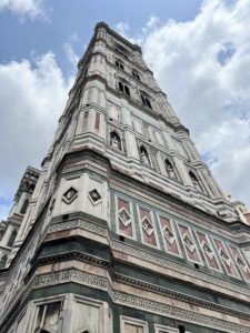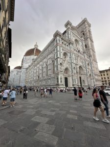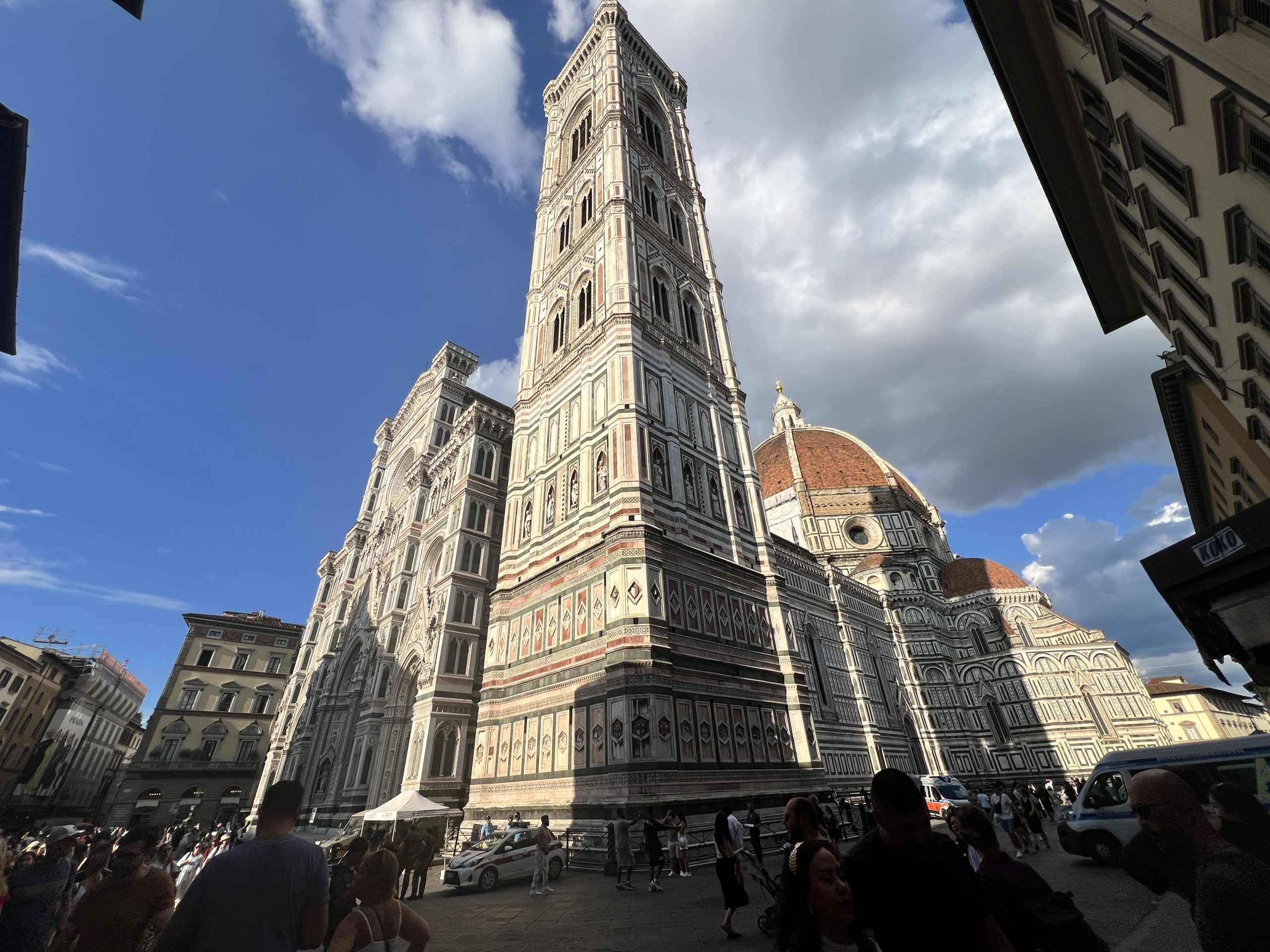 Wir umrunden und bestaunen den Dom. Die unter Cambio erstellte Fassade wurde 1588 abgerissen, jedoch nicht fertiggestellt und erst im 19. Jahrhundert fortgesetzt. Sie besteht aus 3 farbigen Marmor. Er ist der viertgrößte in Europa und eine technische Meisterleistung der frühen Renaissance. 1296 begann man mit dem Bau nach den Plänen von Arnolfo di Cambio. Er wurde 1436 vom Papst Eugen IV geweiht.