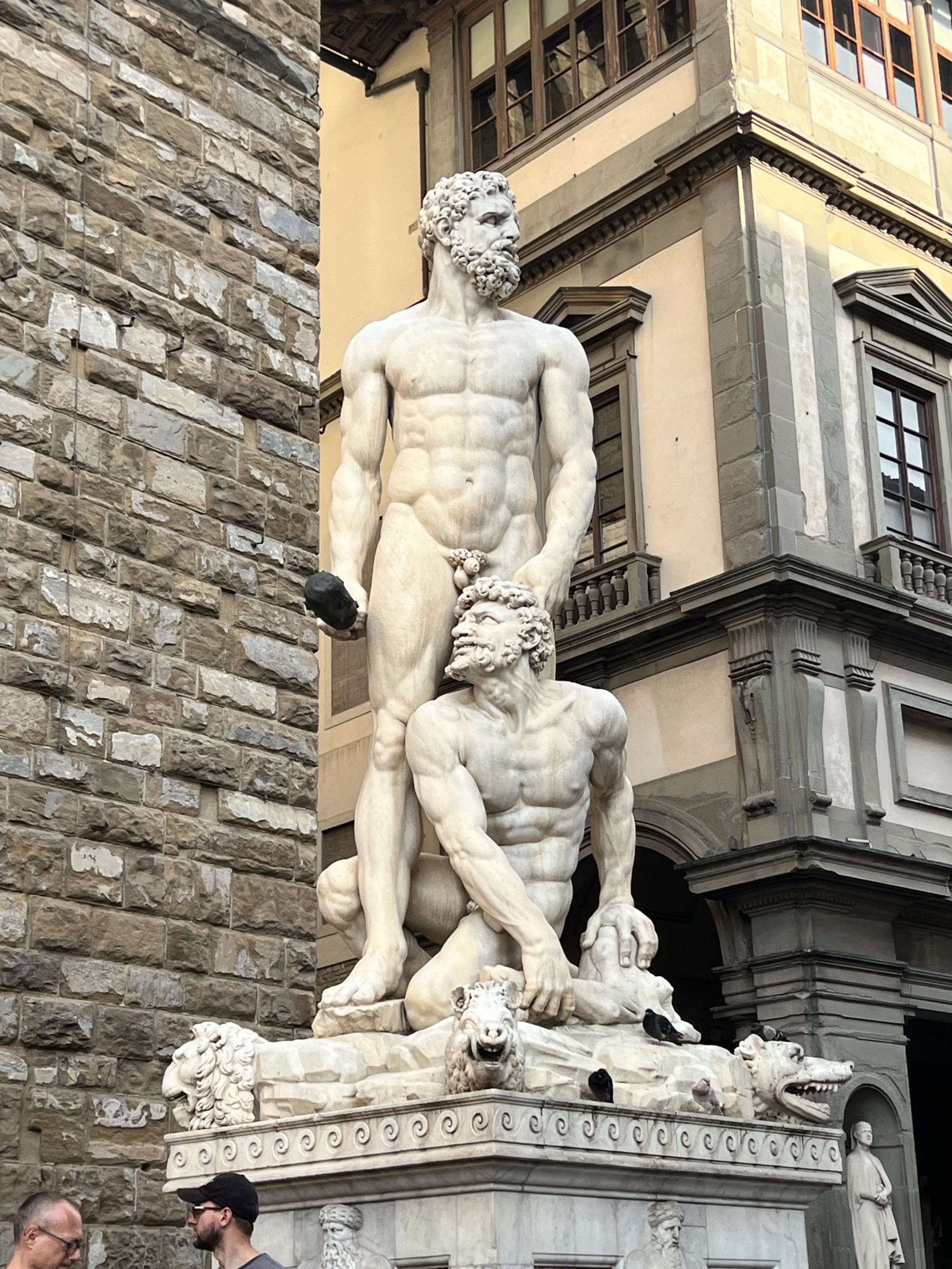 Wir verlassen den Palazzo und befinden uns am Piazzo Signoria. Hier finden wir die Statuen „David“ (leider nur eine Kopie von Michelangelo), die Marmorstatue Herkules tötet Cacus (Baccio Bandinelli) und der Neptunbrunnen (Giovanni da Bologna).