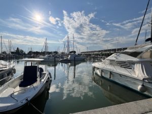 Am nächsten Tag besuchen wir noch unsere ehemalige Heimat Marina. Leider sind an diesem Wochenende keine unserer alten Freunde da. Trotzdem genießen wir das gute Essen und den Blick auf die Marina.