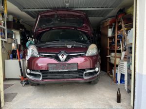 Beim Auto machen wir noch einen Ölwechsel, der Ölfilter wird getauscht, die Nummerntafel entfernt und das Auto in die Garage überstellt. Na wenn das mal nicht sehr knapp ist. Rein geht es nur mit weggeklappten Außenspiegel. dann kommt die Batterie raus und das Auto wird auf Stützen gestellt. Wir hoffen, dass wenn wir wieder zurück kommen alles funktioniert. Vielen Danke, Gerhard, für die Hilfe dabei!