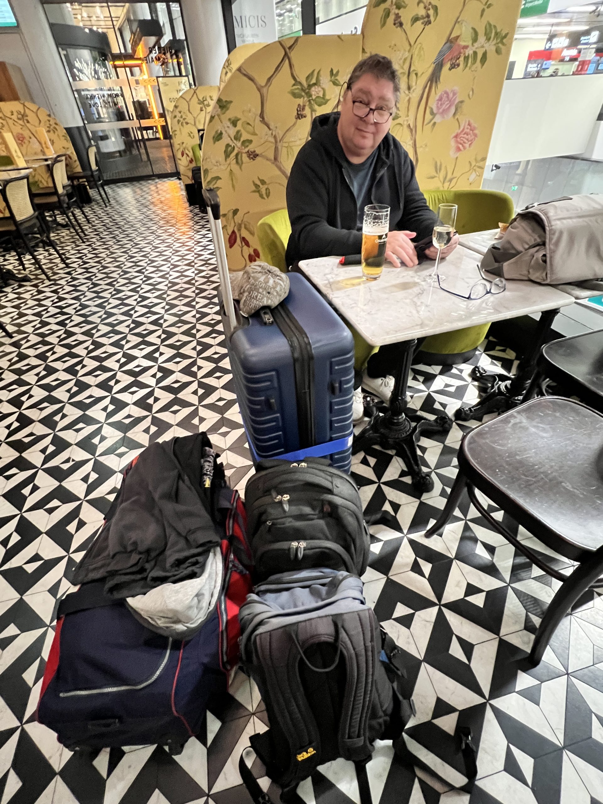 Beim Security Check werde ich wegen meiner neuen Hüfte angehalten. Dort werde ich von eine Frau so richtig begrapscht, obwohl sie mich fragt „Hüfte“?  und ich „Ja, ich habe eine Ausweis mit“.  Ferry’s Rucksack bleibt hängen, bitte alles ausräumen. Zu viele externe Platten führen wir mit, zu viel Leben auf digitalen Seiten.