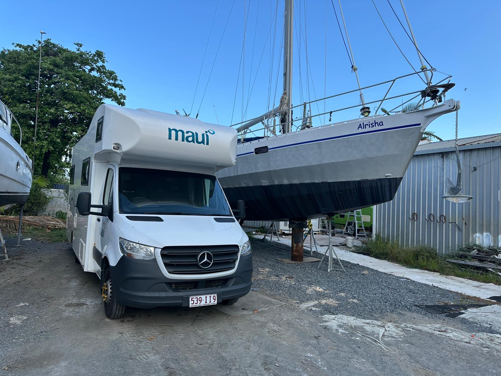 Wir müssen ein wenig warten, aber die Zeit vertreiben wir uns mit ein wenig quatschen mit Deutschen Weltenbummlern. Aber dann sind wir dran. Naja, euer gebuchtes Wohnmobil ist nicht verfügbar. Na toll! Aber wir geben euch ein anderes, ein Upgrade. Ihr habt jetzt Außen Dusche, eine Markise und eine Klimaanlage. Euer Camper ist jetzt 7,7 m lang und 3,6 m hoch. Er schaut echt riesig aus. Schnell ist er übergeben und Ferry macht seine erste Fahrt zu Alrisha. Wir parken das Auto und gehen in den Yachtclub auf ein Bier. Danach fallen wir todmüde in die Kojen und schlafen mal 12 Stunden. Morgen ist auch noch ein Tag.