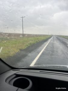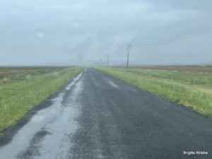Der Regen wird stärker, aber es schüttet nicht. Die Straßen sind teilweise in einem schlechten Zustand und es bilden sich Lacken. Die Straßen werden immer schmäler, bis wir auf geteerten Feldwegen fahren. Ein Vorteil haben die Straßen, dort ist niemand unterwegs.