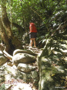Der Weg wird ein schöner Waldweg. Leider müssen wir jetzt die Höhenmeter wieder gut machen, die wir vorher so locker hinunter gegangen sind. Ganz selten war der Wald von Vogelstimmen erfüllt.