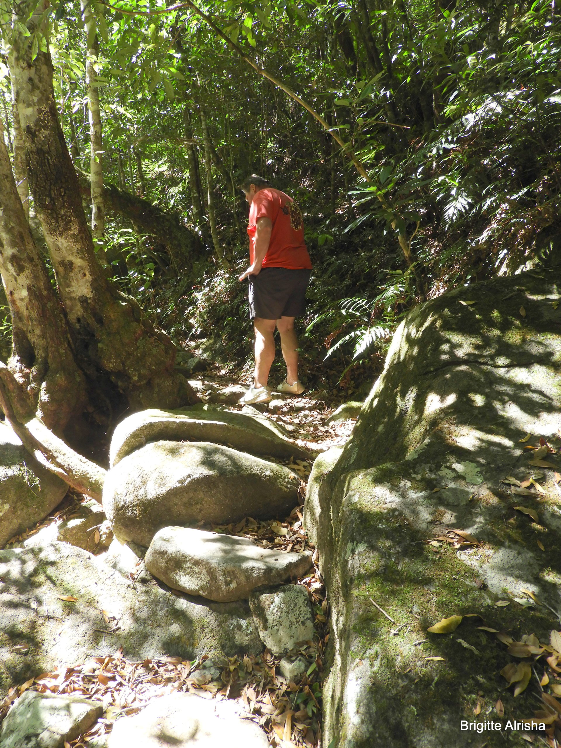 Jedoch als wir zum Fluss kommen ist das „Easy“ aus. Ich habe ein bisschen Angst wegen Ferry, da er ja leichte Gleichgewichtsprobleme seit dem Unfall hat. Aber gemeinsam schaffen wir das. Es geht über viele Steine bergab und dann verlassen wir den Fluss, wo über viele Steine das Wasser hinunter rinnt.