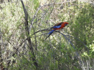 Was uns wundert ist, dass wir hier doch sehr viele Tiere entdecken. Schmetterlinge fliegen immer wieder um uns herum. Wir können ein Pärchen Crimson Rosellas (scharlachroter Papagei) entdecken.
