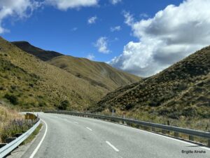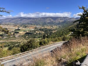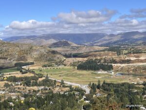Wir biegen auf die Crown Range Road ab ( ca. 300  Höhenmeter) und Serpentinen bringen uns  innerhalb kürzester Zeit auf 620 m. Der Ausblick ist fantastisch.