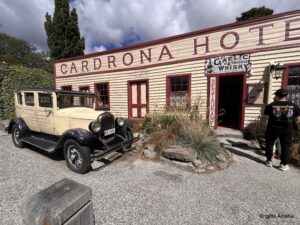 Auf 550 m die erste Ortschaft. Cardrona ist ein beliebtes Skigebiet mit dem gleichnamigen Berg (1936m). Im Ort gibt es das älteste Hotel Neuseelands. Wir bleiben stehen, A wollen wir eine Pause machen und B wollen wir uns das Hotel ansehen.