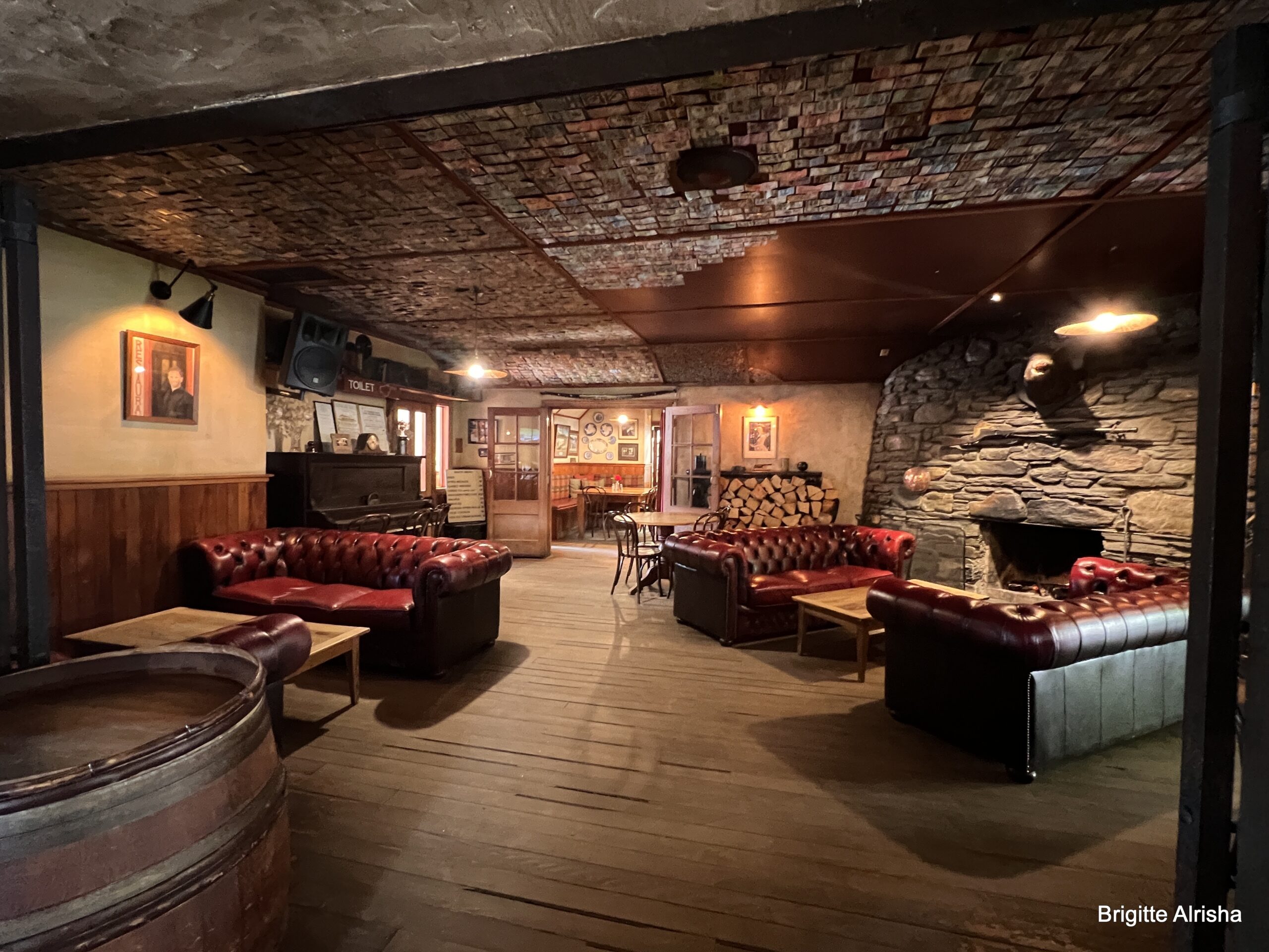 Wir genießen einen Kaffee im wunderschönen Garten und bewundern die alte Einrichtung in der Schank, sowie die Geldscheine an der Decke.