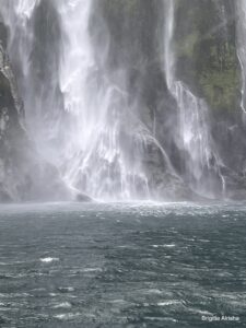 Zum berühmten Wasserfall, der leider nicht ganz so mächtig ist, wie wenn es regnet, fährt er mit dem riesigen Katamaran so dicht heran, dass wir die Gischt im Gesicht spüren. Viel zu schnell heißt es wieder alles unter Deck, wir legen an.