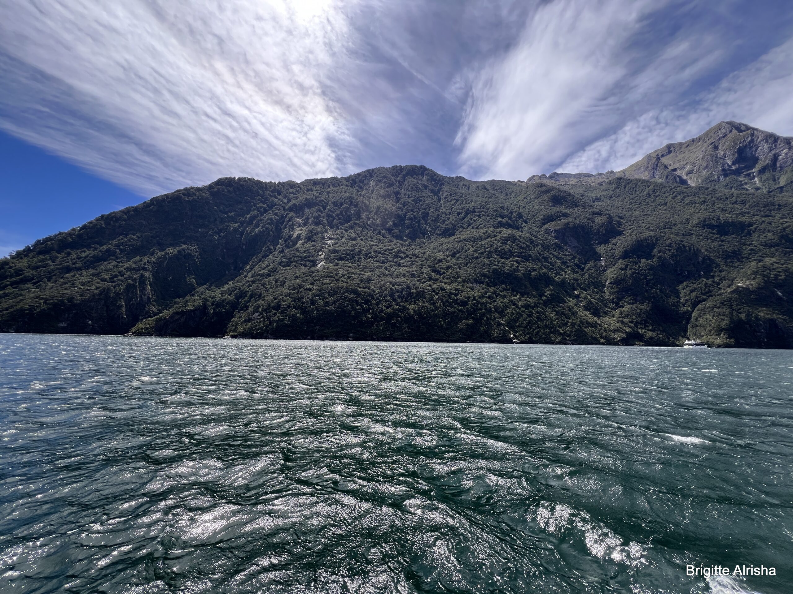 Irgendwie verteilen sich die Leute, keine Ahnung wo sie die alle versteckt haben. Auch an Deck können wir in der ersten Reihe stehen, weggehen ist aber keine Option. Wir genießen das Meer, die Meeresluft und die Sonne. Viel zu schnell sind wir bei der Einfahrt in den Fjord, wo wir umdrehen und nun gegen starken Wind hineinfahren.
