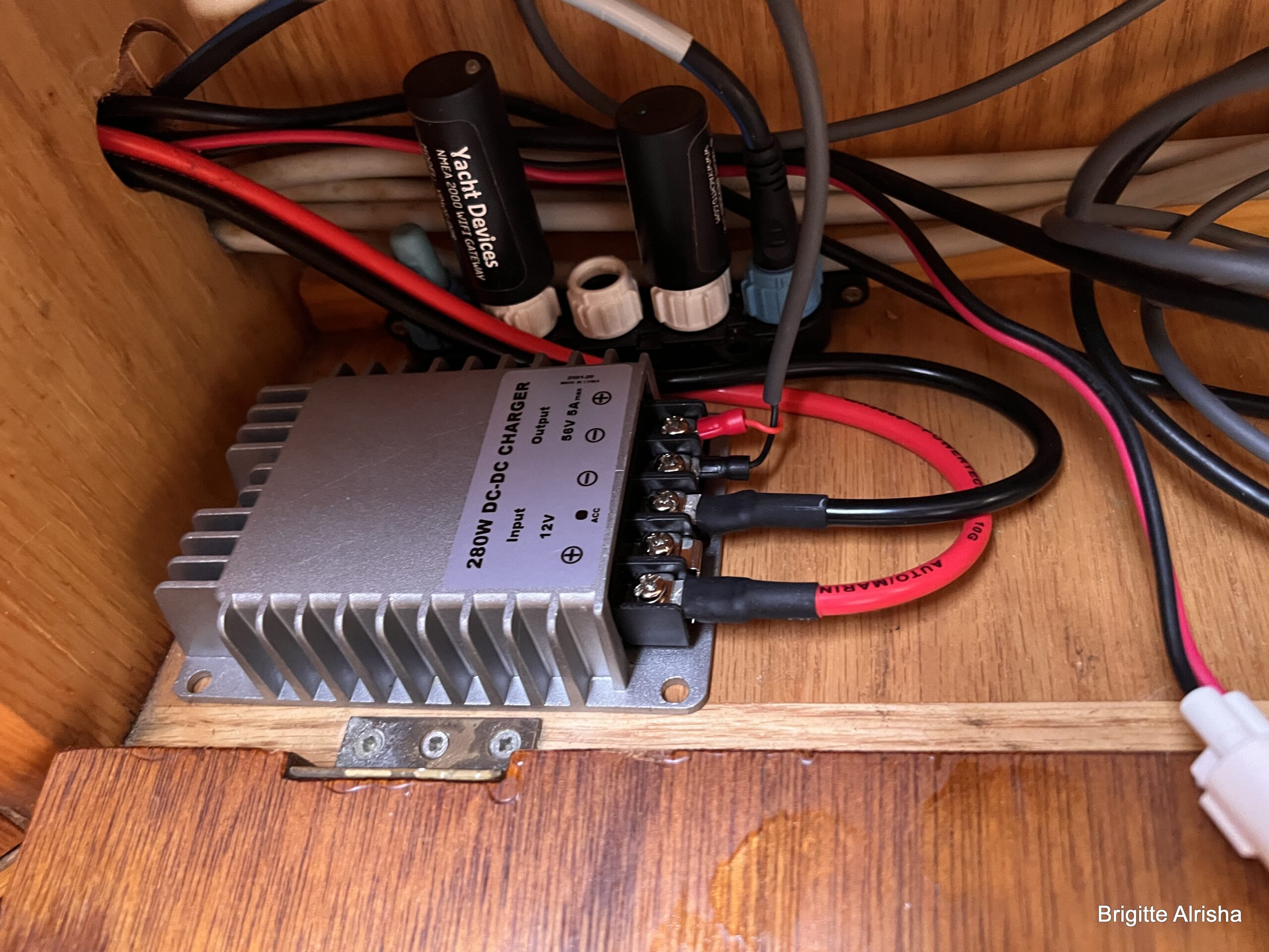 Dann geht es an den Funktionscheck. In der Bordelektrik müssen wir leider feststellen, dass manches während unserer Abwesenheit gelitten hat. So zum Beispiel versagt die Hydraulikpumpe des Autopiloten mit der Fehlermeldung: „No Drive detected“. Kabel korrodiert, möchte man meinen, aber das alleine war’s nicht. Kein Echolot Signal am Tridata Navigationsdisplay. Das kann ein defekter Geber sein, oder ein Fehler im Tridata, oder beides! Hier setzte ich meinen Backupplan nun durch und installiere ein ITC-5. Dieses Teil speist analoge Geber, wie den DST800, direkt in den STNG Bus ein. Apropos „alte Raymarine Installation“. Das ST60 Multi über unserem Niedergang piepst nur mehr und will sich nicht mehr auf eine bestimmte Anzeige einstellen lassen. Hier werde ich ein i70s installieren, wenn ich eines günstig bekomme. Das SPUR Kabel ist fast schon dort.