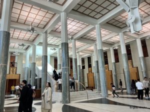 Wir sehen uns nur das neue Parlament genauer an. Der Eintritt ist gratis. Das Gebäude steht auf einem Hügel, nein eher ist es in einen Hügel hineingebaut. Es schaut von vorne fast wie ein Bunker aus.