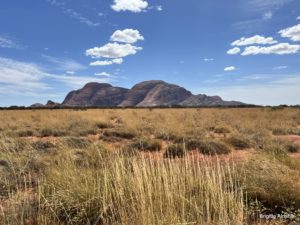 Auch der Kata Tjuṯa, bedeutet „viele Köpfe“,  bekommt eine rötliche Färbung und ist auch vom Uluru aus sichtbar. Wir wollen auch ihn besuchen, aber vorher brauchen wir noch ein Frühstück. Als wir dort ankommen ist es bereits viel zu heiß, um an einen kurzen Ausflug zu denken. Wir geben uns mit dem Blick vom klimatisierten Auto aus zufrieden.
