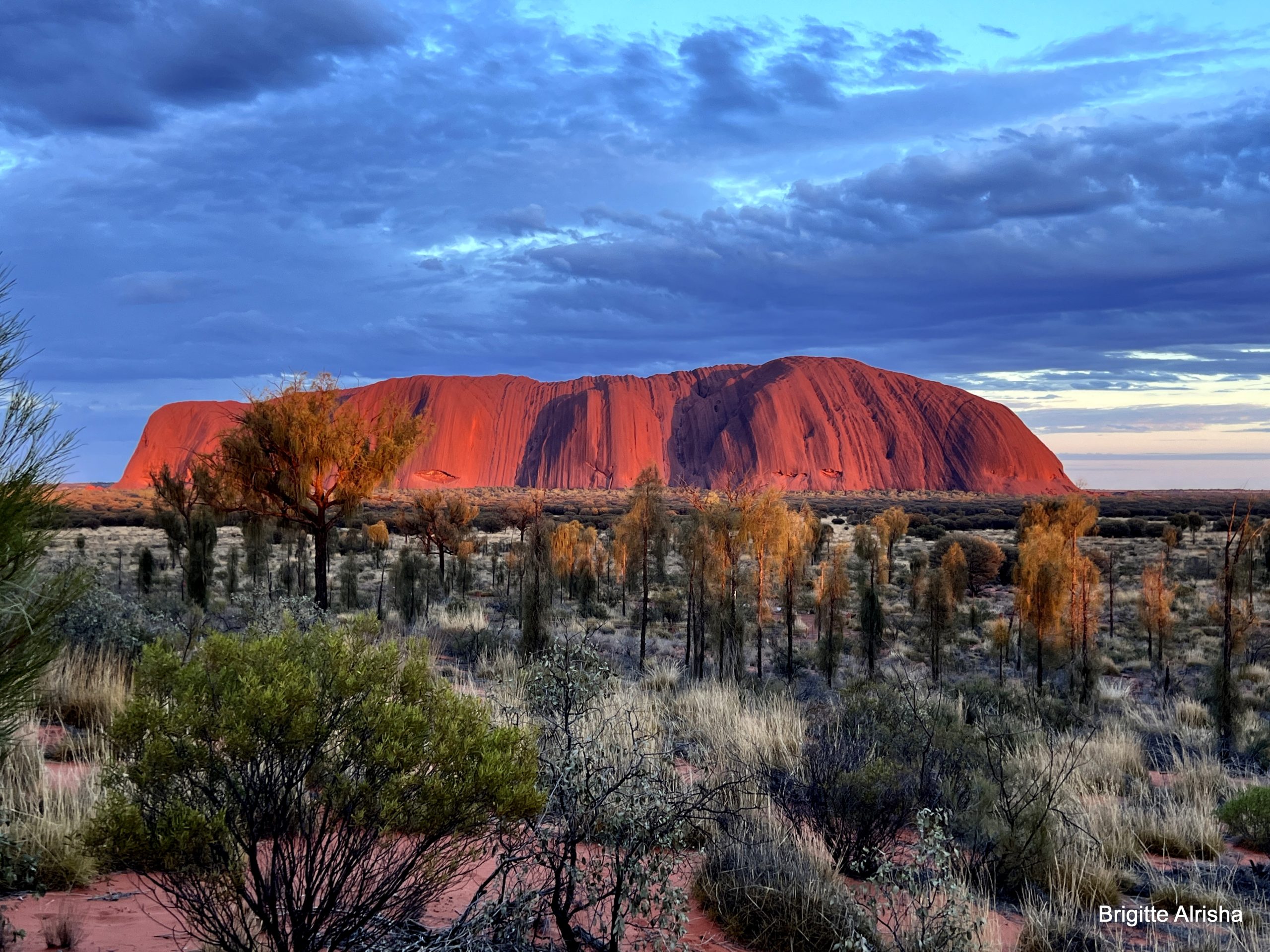 Trotzdem es ist ein einzigartiger Sonnenaufgang und wenn man sich dann umdreht und die Sonne den Berg anstrahlt, beginnt er ganz langsam von unten nach oben rot zu leuchten. Kein Wunder dass dieser Berg heilig ist. Der Uluru ist etwa 3 km lang, bis zu 2 km breit und hat an der Basis einen Umfang von rund 9 km und besteht aus Sandstein der sich ca. 350 m über sein Umland erhebt.