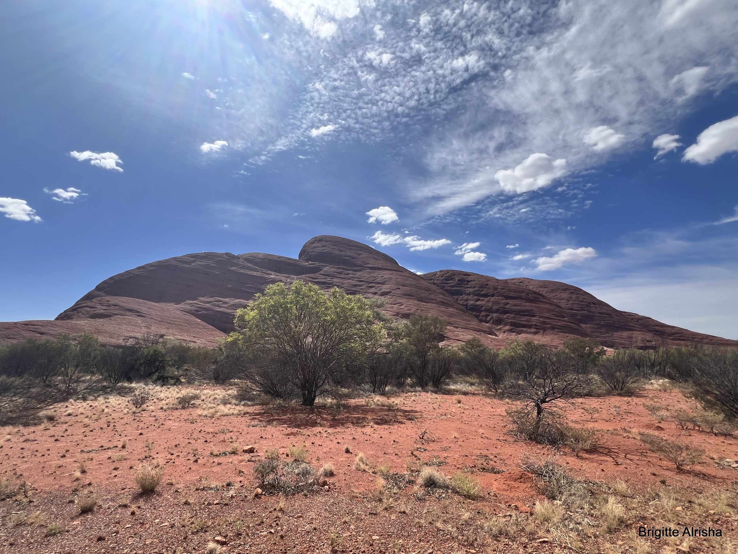 Auch der Kata Tjuṯa, bedeutet „viele Köpfe“,  bekommt eine rötliche Färbung und ist auch vom Uluru aus sichtbar. Wir wollen auch ihn besuchen, aber vorher brauchen wir noch ein Frühstück. Als wir dort ankommen ist es bereits viel zu heiß, um an einen kurzen Ausflug zu denken. Wir geben uns mit dem Blick vom klimatisierten Auto aus zufrieden.