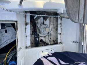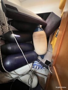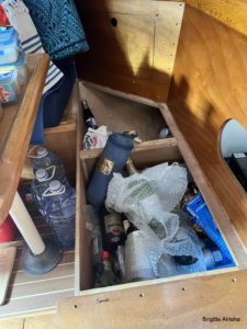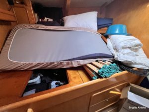 Der zweite Schock kommt unter Deck. Der Salon rund um den Schwertkasten ist ausgeräumt und aller Inhalt am Tisch malerisch verteilt. Die Sitzpölster sind im Salon und im vorderen Bad verstaut. Die Sitzbank selbst ist komplett entfernt. In der Eignerkoje ist das Bett offen und im Bad stehen die leeren Dieselkanister und die Fender versperren den Zugang zu den Schapps.