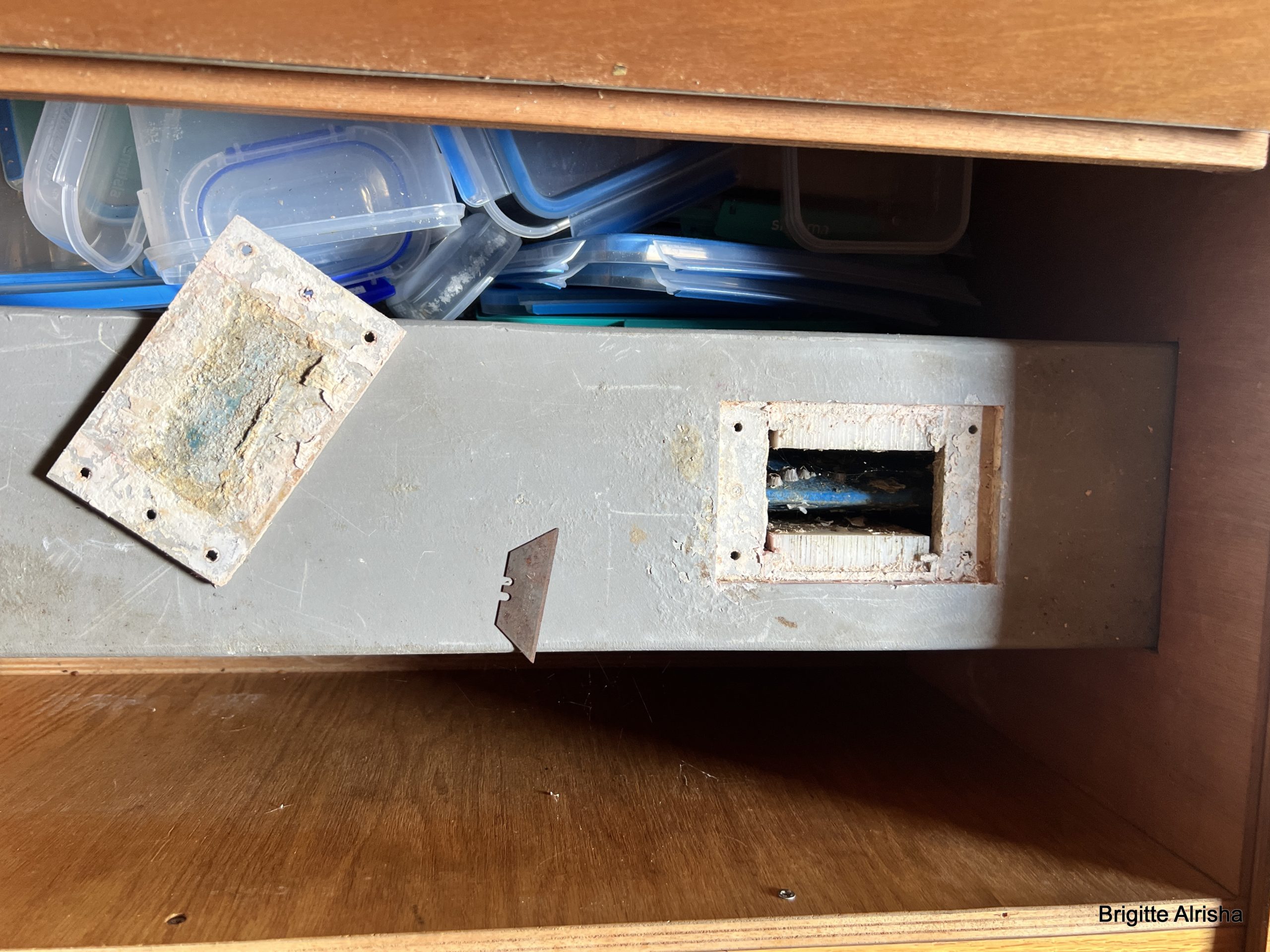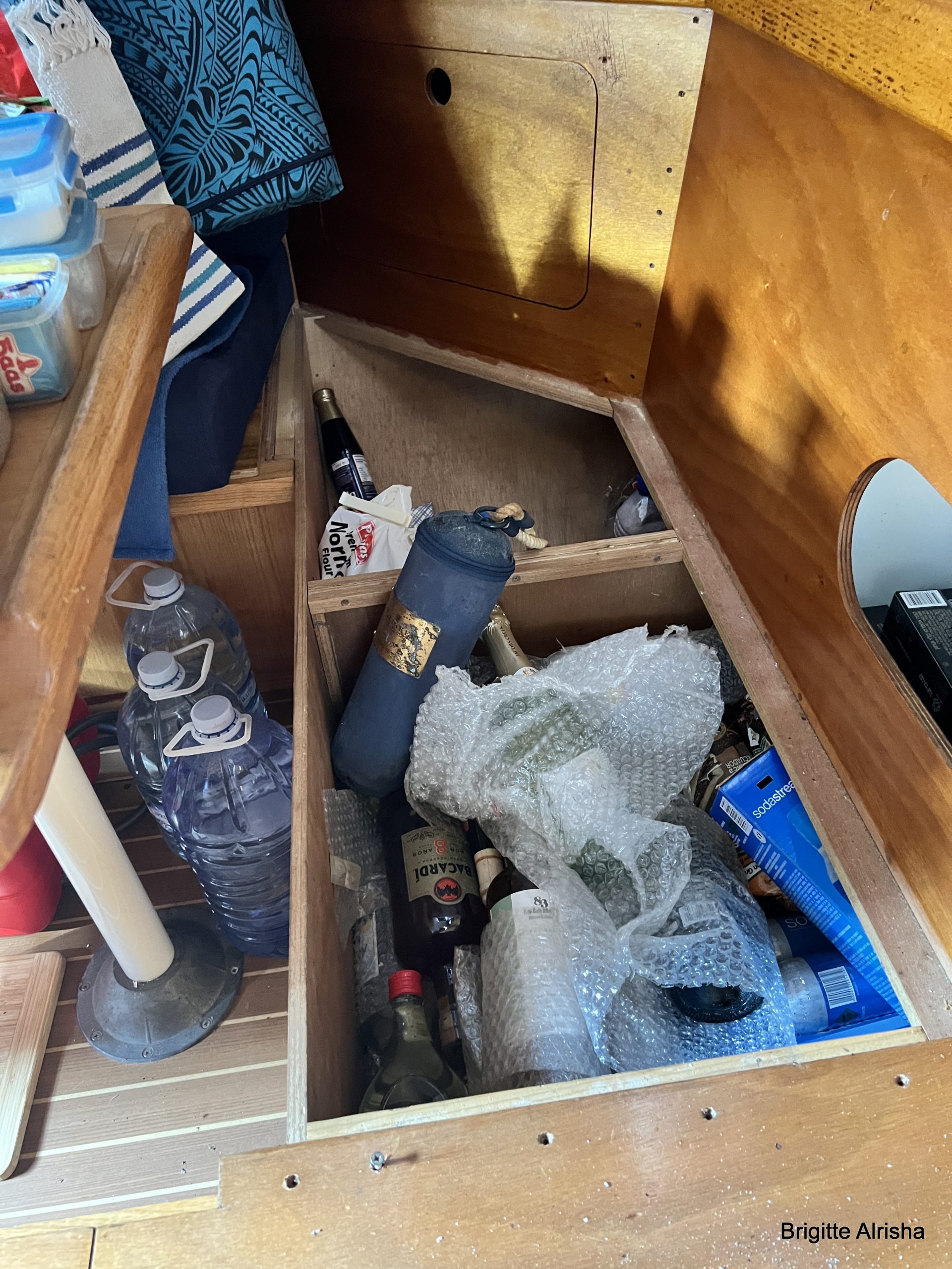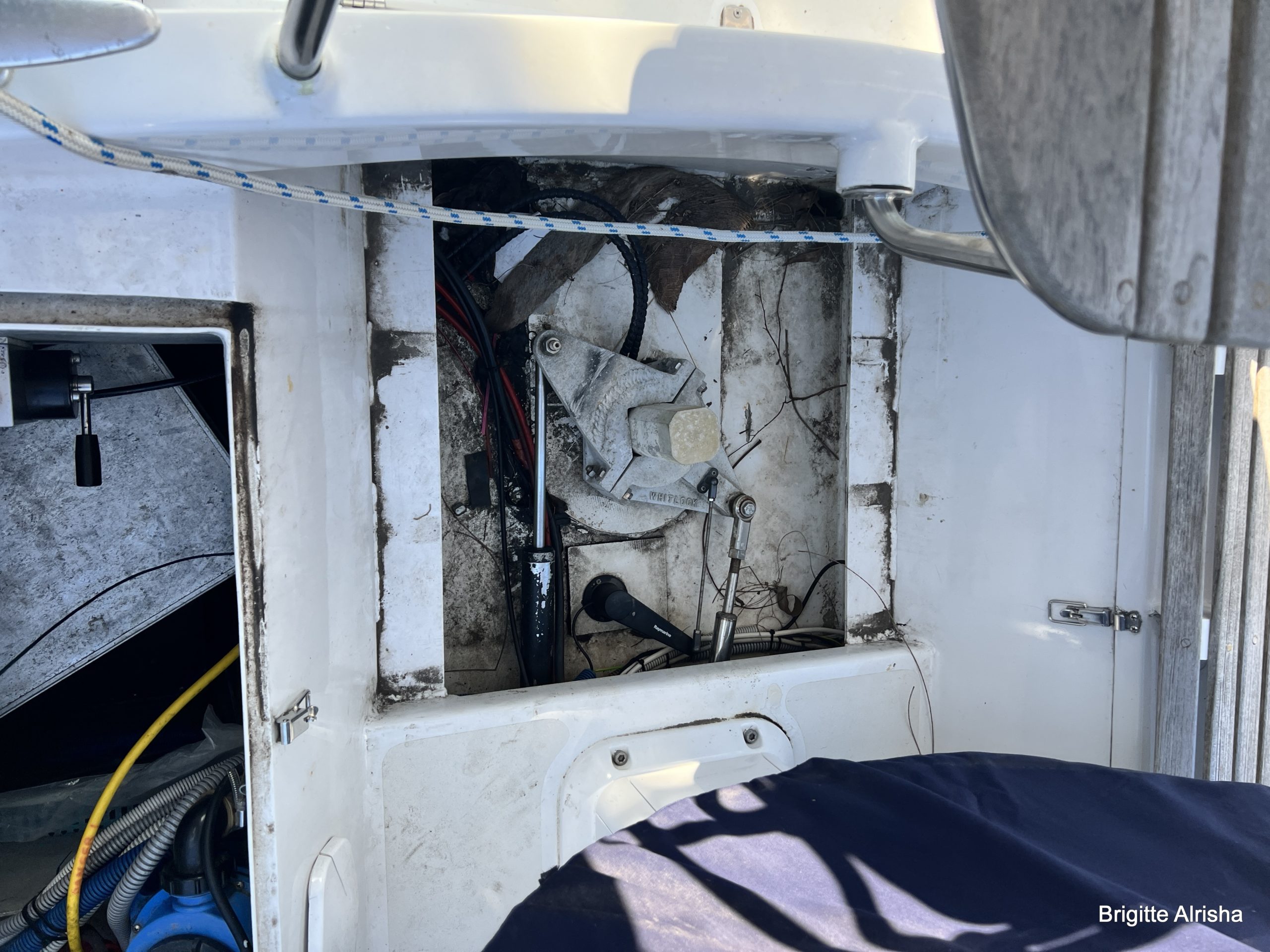 Ausgeschlafen suchen wir uns eine Leiter und besuchen Alrisha. Der erste Schock, die Backkiste ist offen. Super, da regnet es rein und füllt unsere Bilge mit Wasser. Absaufen an Land! Auch ist unser Niedergang nicht versperrt und da klappt ganz leicht das Steckschot nach innen und alle möglichen Tiere können so ein neues Heim finden.
