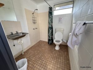 Bei unserem jetzigen Campingplatz haben wir unser eigenes Bad, gleich neben dem Camper, praktisch, nicht?. Nach dem Duschen will ich das Handtuch über die Stange vom Duschvorhang werfen, jedoch verfängt sich das Badetuch in der Sparlampe.