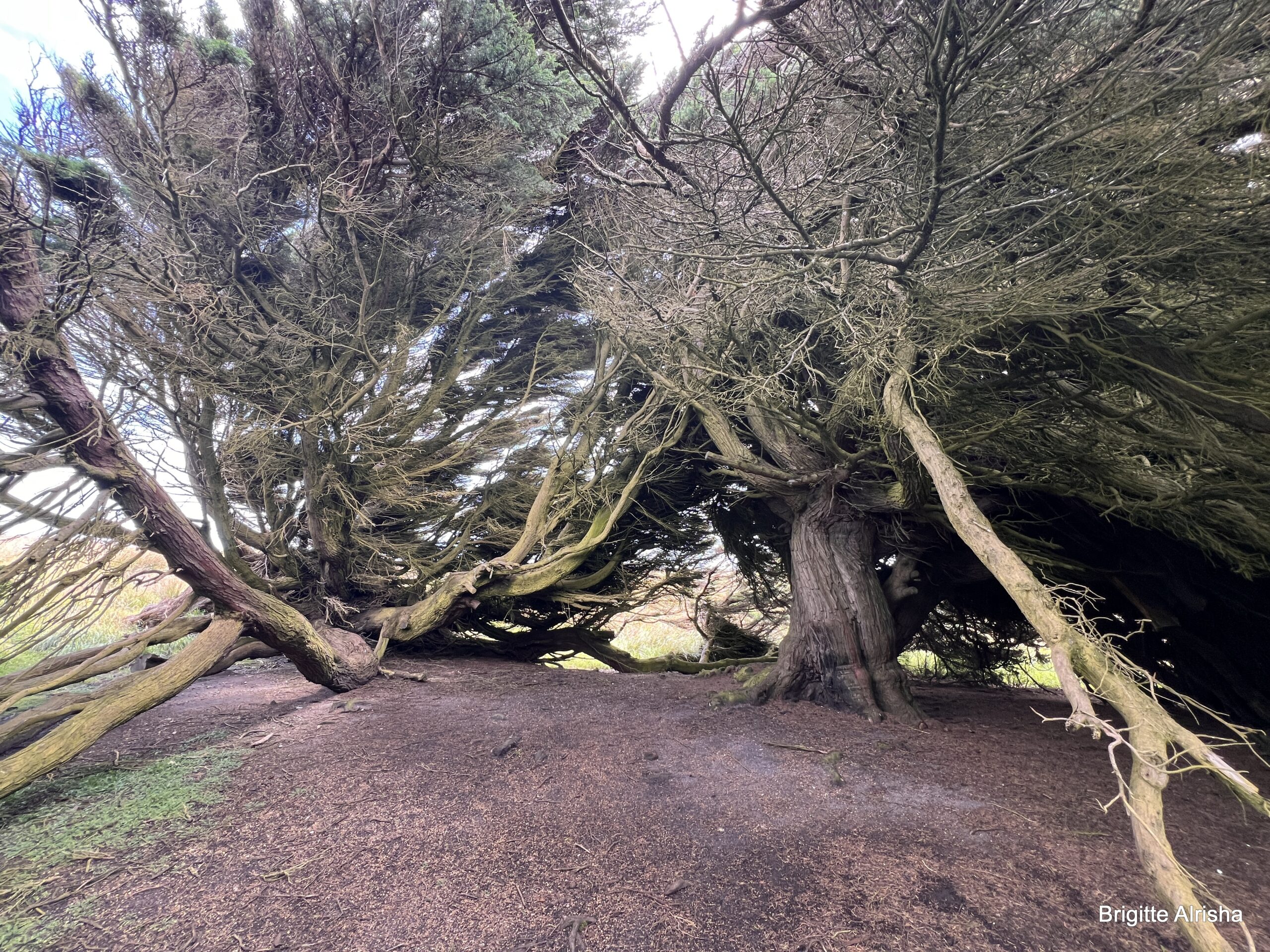 Ich mach noch einen Abstecher zu den alten Macrocarpa (Zypressen). Die starken Küstenwinde beeinflussen den Baumwuchs. Die verdrehten, knorrigen Äste und die stark tief herabhängenden bilden einen guten Windschutz.